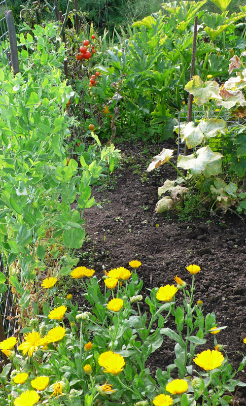 A second sowing of mangetout are cropping well and the courgettes continue to play hide and seek. I'm tired now of picking cucumbers and the leaves have mildewed, so that's it for this year.